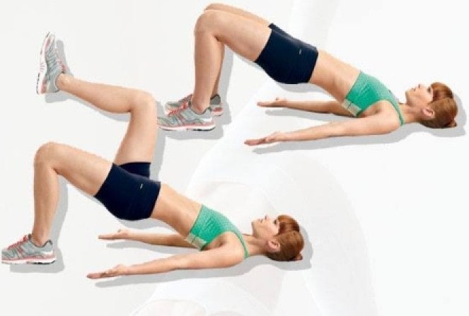 엉덩이와 허벅지 라인을 살려주는 최고의 운동! 무릎을 세운 상태로 누워서, 엉덩이를 천천히 들어 올렸다 내리기를 반복해 주세요. 15~20회 진행! 🍑🔥